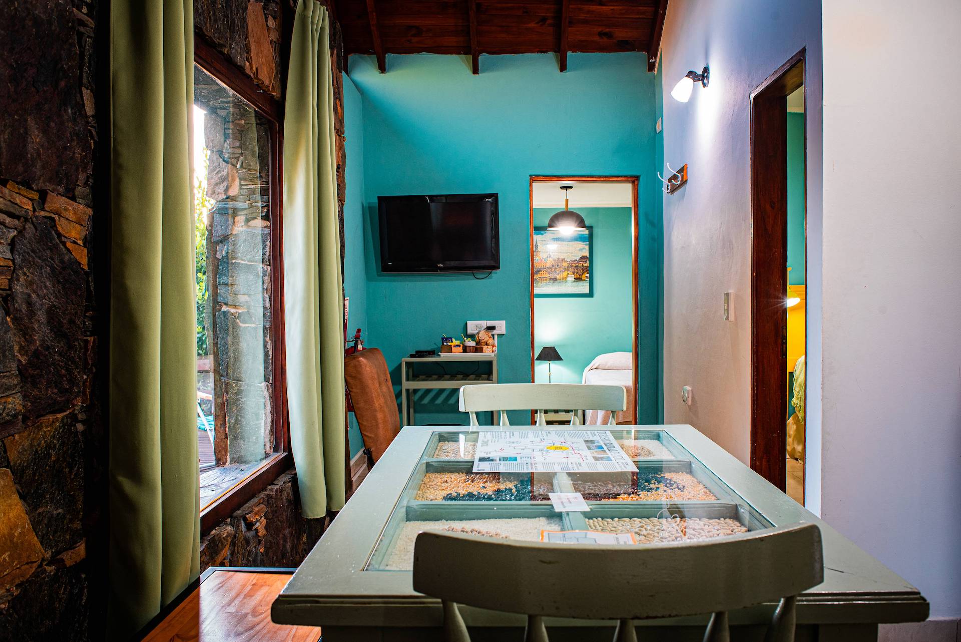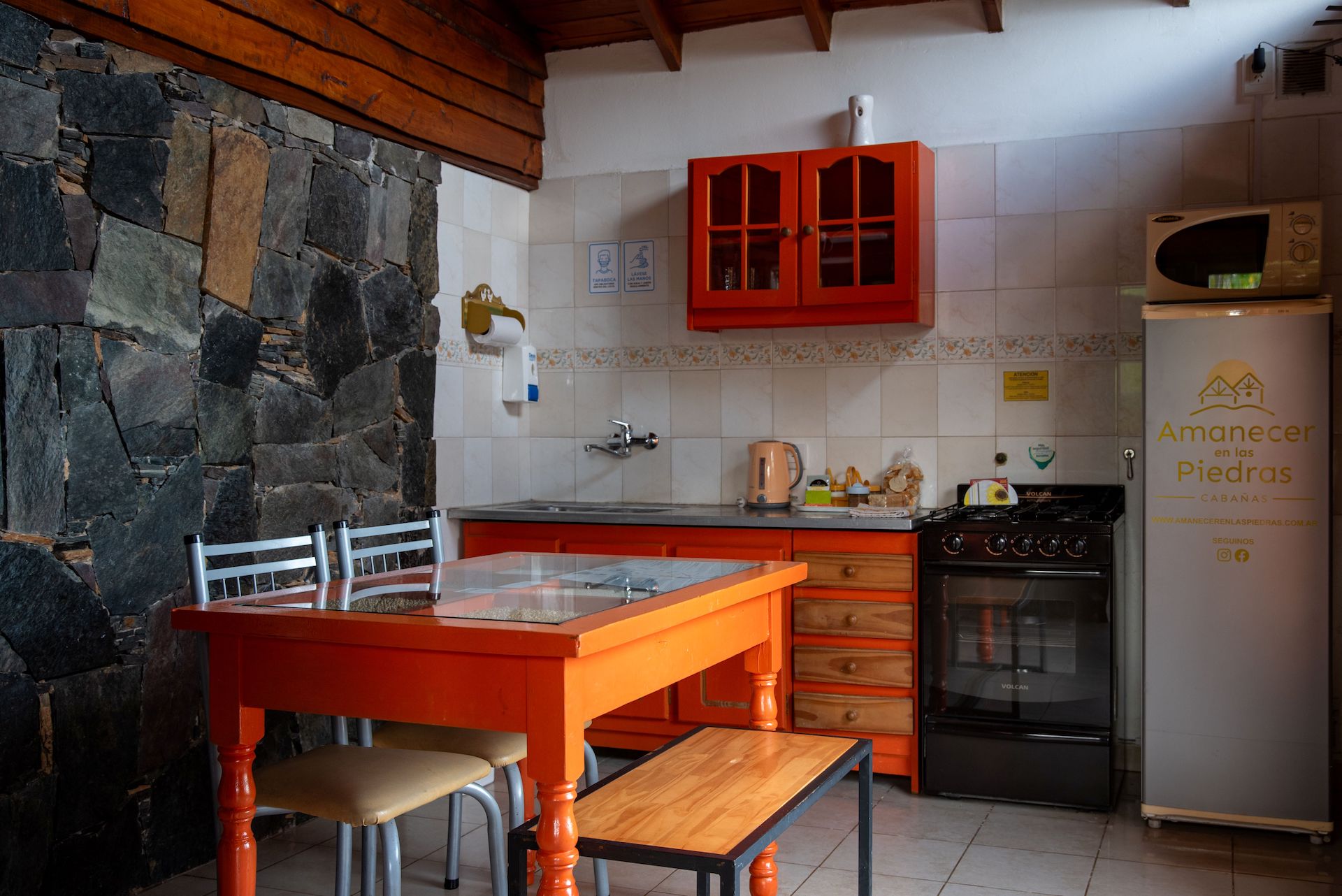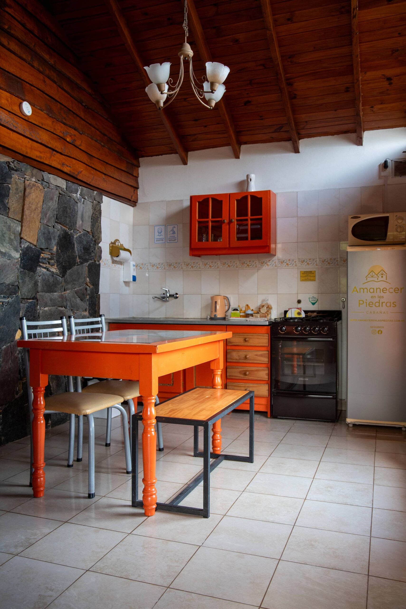 Disfrutá de un almuerzo o cena desde el comedor de la cabaña con vista al parque o desde el deck con vista a las sierras. Las piedras, la tranquilidad y el paisaje serán el escenario que acompañará tu encuentro familiar, junto a la mesa cerealera con su encanto de siempre. Por la noche, la luna plateada se ve desde tu cama. La calefacción brinda su calidez en invierno y el aire serrano su frescor retenido en las paredes de piedra en verano.