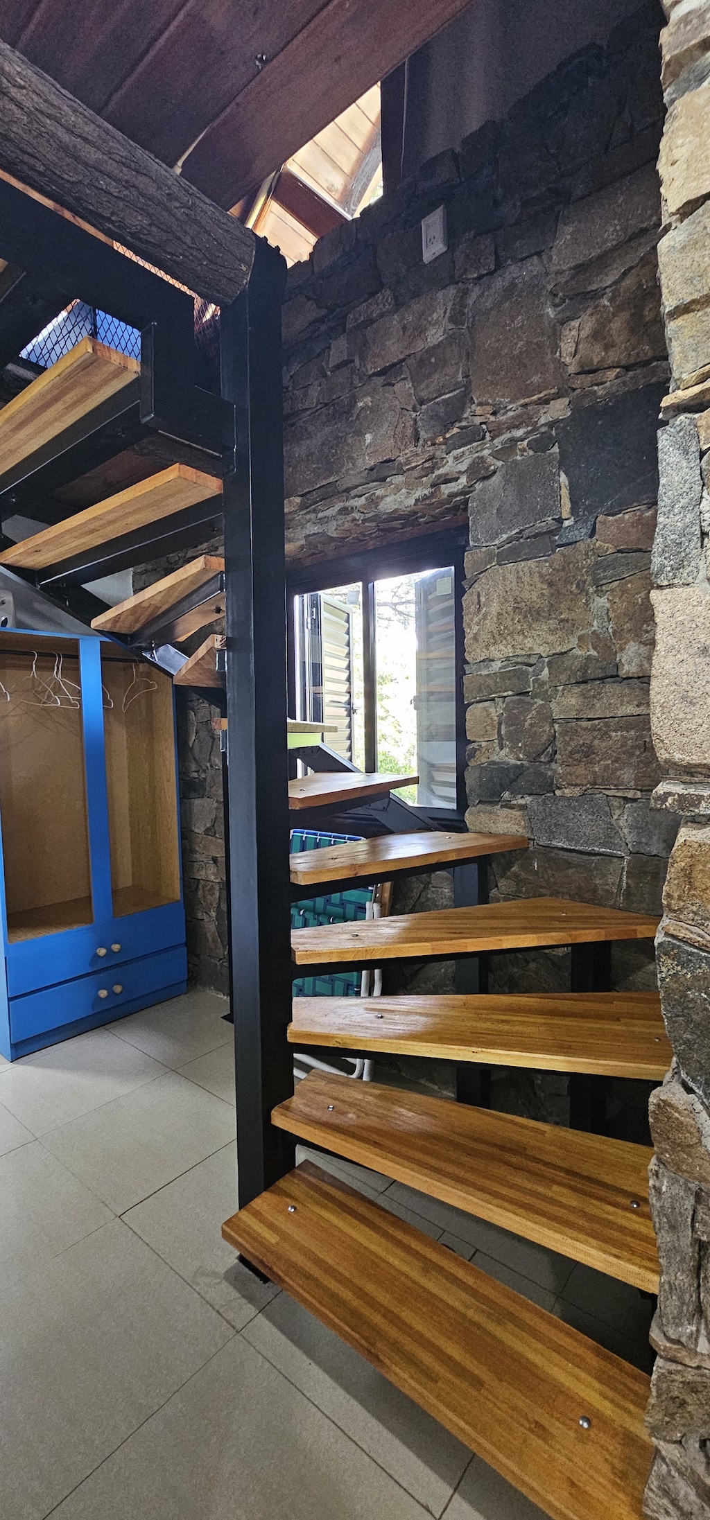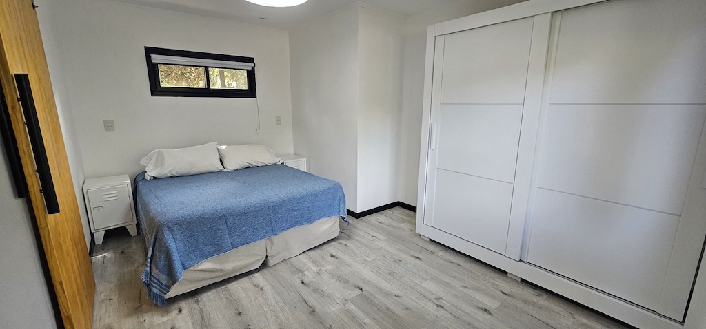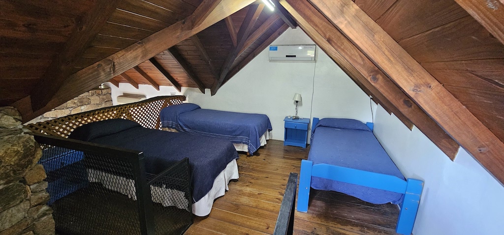 Nuestras cabañas para 5 personas tiene un estilo loft en dúplex, con un entrepiso abierto donde se encuentra la cama matrimonial y dos camas individuales. Y en la planta baja, una cama individual.