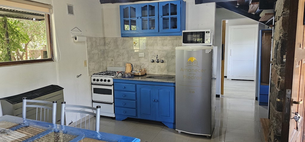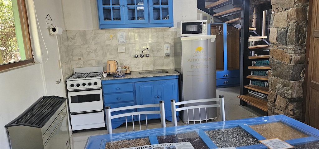 Dispone de cocina de cuatro hornallas con horno a gas, microondas, heladera y televisor. Tenés a disposición toda la vajilla para que te prepares el desayuno en el horario que quieras. Diariamente podrás encontrar: tostadas, galletitas de agua, manteca, mermelada, dulce de leche, queso untable, porciones de torta, leche, te, café, yerba y azúcar. También contamos con desayuno para celíacos (bajo pedido). Parrilla y estacionamiento individual en cada unidad.